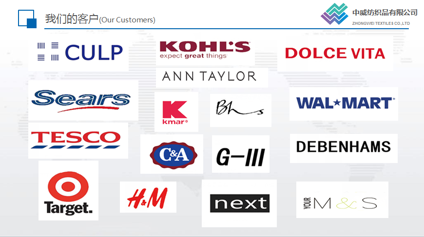 中威紡織主要經(jīng)營(yíng)麂皮類(lèi)家紡及各類(lèi)服裝面里料,并可根據(jù)客戶(hù)要求研發(fā)、生產(chǎn)及深加工各類(lèi)面料。公司產(chǎn)品遠(yuǎn)銷(xiāo)美國(guó)、墨西哥、南美、歐洲等世界各地。公司自成立以來(lái),憑著優(yōu)良的品質(zhì)、合理的價(jià)格以及完善的服務(wù),贏得了國(guó)內(nèi)外客戶(hù)的信賴(lài)。目前公司已與世界眾多大品牌建立了良好的業(yè)務(wù)往來(lái)。